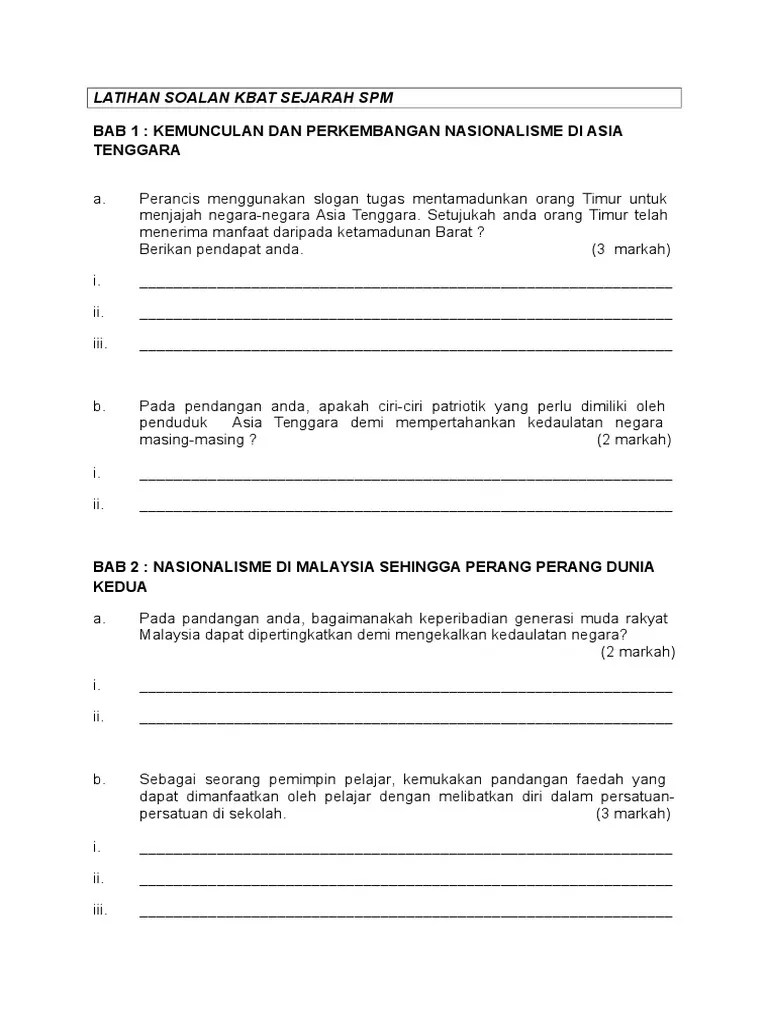 Kssm sejarah tingkatan 4 dan 5 ▫ koleksi soalan kbat berdasarkan elemen kewarganegaraan dalam standard pembelajaran (sp) Here is a summary of about soalan kbat sejarah tingkatan 4 kssm best after simply placing symbols one can 1 piece of content to as much completely readers . 1) biasanya soalan sudah diberikan awal. Bab 3 konflik dunia dan pendudukan jepun. Bab 1 warisan negara bangsa. Bab 1, 2, 3, 4, 5, 6, 7, 8, 9, 10.